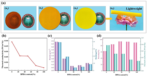 圖8. 制備的PIAs的綜合性能:(a)制備的PIAs與先前報道的氣凝膠和泡沫的導熱性和耐溫性的比較;(b)制備的PIAs與之前報道的氣凝膠的密度和收縮率的比較。