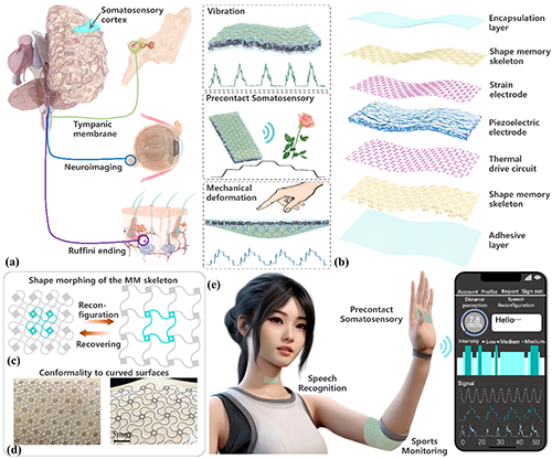 力學(xué)超材料由于具有優(yōu)越的力學(xué)性能已被廣泛應(yīng)用于航空航天、柔性電子等多個(gè)領(lǐng)域。柔性電子器件與待測(cè)組織的緊密貼合與動(dòng)態(tài)隨形能力對(duì)測(cè)量數(shù)據(jù)的準(zhǔn)確性至關(guān)重要,提升柔性電子器件的順應(yīng)性能顯著降低器件的接觸阻抗、提升信噪比、防止運(yùn)動(dòng)偽影的產(chǎn)生。然而由于生物組織和人造材料的不同性質(zhì)及其界面的復(fù)雜性,實(shí)現(xiàn)身體隨形的電子器件仍面臨著突出挑戰(zhàn)。利用具有自感知和形狀記憶功能的材料制造智能力學(xué)超材料,有望協(xié)調(diào)柔性電子器件與不同生物組織之間的力學(xué)失調(diào),并實(shí)現(xiàn)力學(xué)性能之外的主動(dòng)功能,如傳感、能量收集、致動(dòng)、自適應(yīng)、計(jì)算和信息處理。本文通過將形狀記憶超材料和壓電材料整合到電子皮膚結(jié)構(gòu)中,實(shí)現(xiàn)了電子皮膚的多模態(tài)信號(hào)感知和形狀記憶驅(qū)動(dòng)功能,該電子皮膚在物聯(lián)網(wǎng)、腦機(jī)接口等革命性領(lǐng)域具有廣闊的應(yīng)用前景。