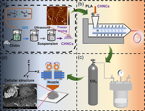 為了獲得良好孔隙結構和機械性能的PLA基支架,首先,通過低共熔溶劑法制備CHNCs,將其與PLA進行熔融共混,隨后進行原位發泡打印(圖1)。