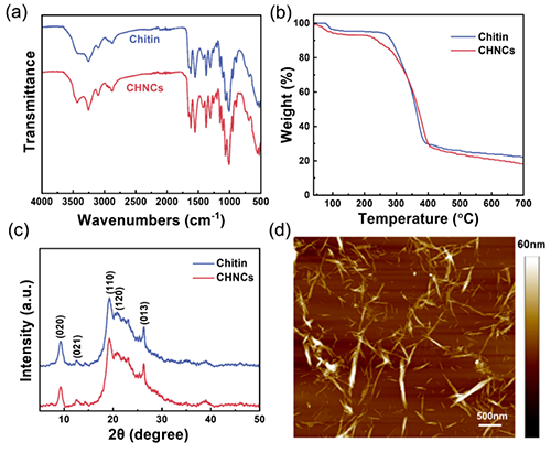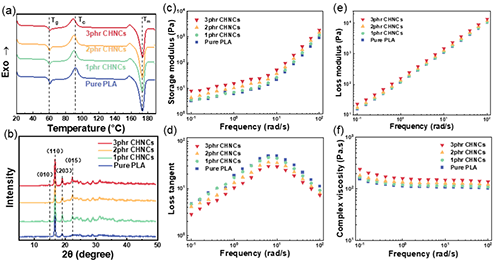 通過FTIRDSCXRDDHR方法CHNCs復合支架進行了表征(圖2,圖3),發現CHNCs改善了PLA的熱行為和流變行為,提高了PLA的加工性能。