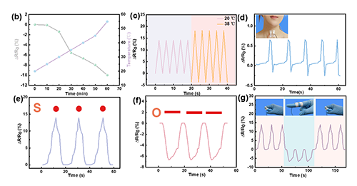 研究表明通過觀察水凝膠的GF值變化,可評估其應變傳感性能。在0-400%應變范圍內GF的值約為0.58,超過400%后急劇上升至8.76。并且水凝膠在不同應變下具有可重復且穩定的電信號。在肘部、手腕和手指的彎曲監測中,傳感器展現出卓越的可重復性和穩定性。同時,水凝膠的溫度敏感性使其成為醫療傳感器的理想選擇。在生物傳感方面,模擬了發熱狀態下的傳感應用和老年病人的輔助識別需求,展現出其在智能醫療領域的潛在應用價值。