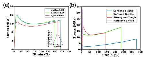 圖2. (a) 展示了實際材料力學性能測試中隨機誤差的現(xiàn)象及其概括方法。(b) 通過一些例子,展示了材料設(shè)計空間中包含的廣泛且不同的力學性能。