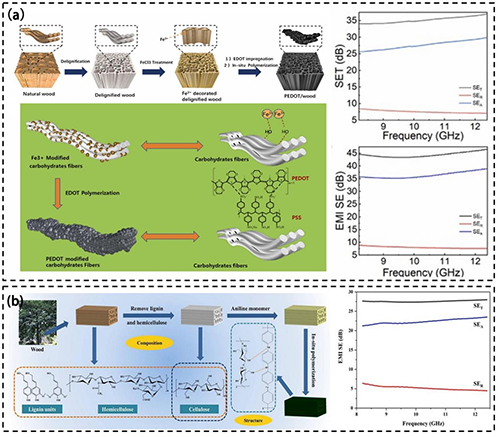 圖9. 高分子聚合物/木基電磁屏蔽復合材料的制備。(a)PEDOT/木材的制備方案和復合材料EMI屏蔽性能;(b)PANI-WA氣凝膠和木材的制備工藝以及復合材料的EMI屏蔽性能。