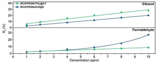 圖四展示了細菌纖維素復合材料在不同揮發性有機物上的氣體感應性能。結果表明,該復合材料對可揮發有機化合物具有較強的實時監測響應性能。含有氧化鋅的復合材料在濃度為10 ppm的丙酮時表現出優異的性能,實時電阻變化值高達64%。氧化鋅在甲醛檢測方面也優于二氧化鈦,而僅在乙醇檢測方面,二氧化鈦的峰值響應(28%)略優于氧化鋅(27%)。與單純使用純石墨烯相比,使用石墨烯聯合氧化鋅或二氧化鈦可以顯著提高傳感系統對揮發性有機物的響應速度和可逆性。含有二氧化鈦的復合材料的最小可檢測濃度約為1.43 ppm,足以分析人類呼出的丙酮以達到預診斷疾病功能。含有氧化鋅的傳感器表現出與甲醛濃度指數相關性和極低檢測閾值。該靈敏度水平足以實時監測甲醛TLV濃度(0.75 ppm),以確保人類健康和日常工作的安全保護。