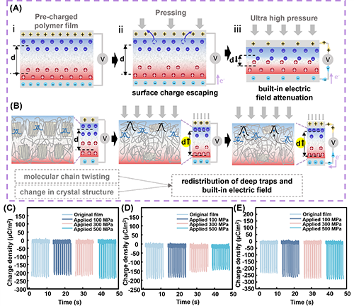 摩擦納米發電機(TENG)因其適應性、靈活性和生態友好性而具有廣泛的應用前景。幾乎所有聚合物都能產生摩擦起電效應。研究三電聚合物的內部電荷轉移行為可以更好地促進能量收集過程中的能量轉換效率,有助于拓寬摩擦電聚合物在自供電傳感領域的應用場景。摩擦運動過程中,施加的正壓力是影響電荷輸出性能和摩擦電器件壽命的主要因素之一。然而,以往對基于 TENG 的聚合物基傳感器的研究主要集中在提高靈敏度和穩定性方面,傳感范圍更多集中在弱壓方面,其上限很少超過 10 兆帕,高壓力下摩擦電荷轉移過程與能夠在高壓力作用下應用的聚合物基TENG仍有待進一步探究。另一方面,已有研究表明,超高壓力能夠影響如相變、彈性性能和與缺陷相關的變形機制,從而影響材料物理性能,實現對材料特殊性能的操縱。因此,全面探索超高壓下摩擦電聚合物材料的結構和電荷轉移性能,可加深對摩擦電材料的理解,促進摩擦納米發電機在極端條件下的應用。