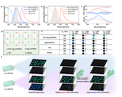 此外,研究團隊還發現,在競爭路徑調控下的Ag(I)/PVPCC和連續路徑調控下的Al(III)/PVPCC組裝體系中,不僅可以實現基態手性的可循環動態反轉,同時也能實現圓偏振發光(CPL)的動態反轉過程。這表明,通過精確控制組裝條件,可以有效調控超分子組裝體的手性和發光性質。最后,該研究團隊進一步利用手性能量共振轉移策略,將Ag(I)/PVPCC與硫黃素TThT)進行共組裝,成功實現了基于Ag(I)/PVPCC-ThT共組裝體系的動態光學信息加密功能的概念驗證(圖4所示)。這項工作不僅展示了超分子組裝體在手性調控方面的靈活性和多樣性,也為開發新型智能材料和器件提供了新的思路和技術手段。