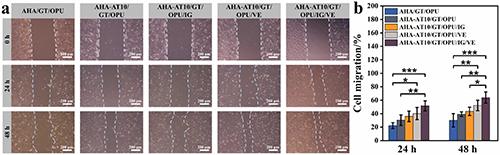 圖5 (a) HUVECs劃痕和遷移的代表性光學(xué)圖像。(b) 各冷凍凝膠組細(xì)胞遷移率統(tǒng)計(jì)(n=5)。*p < 0.05,**p < 0.01,***p < 0.001。