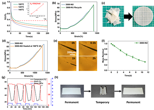 近期,清華大學化工系徐軍團隊受基礎的高分子結晶原理啟發,提出了一種通過調節交聯網絡拓撲均勻性,強化結晶性聚合物力學性能的方法。使用聚己內酯(PCL)、六亞甲基二異氰酸酯和和1,1,1-三(4-羥基苯基)乙烷制備了具有不同網絡均勻性的交聯聚氨酯(圖1)。當PCL的分子量較低時,聚合物沒有結晶度或結晶度很低,非均勻交聯網絡會降低力學性能(圖2)。當PCL的分子量較高時,由于結晶能力的提高,非均勻的交聯網絡將增強材料的機械性能,包括模量、強度和韌性(圖3)。進一步的分析表明,這種優異的機械性能是基于高結晶度、氫鍵和化學交聯的共同貢獻。交聯點處的苯酚氨基甲酸酯動態鍵能夠實現有效的自愈和重復加工,而不會犧牲機械性能,PCL鏈段也賦予了其生物降解性(圖4)。結合交聯結晶聚合物固有的形狀記憶功能,3000-NU可以實現形狀記憶輔助的自愈合,從而修復毫米級裂紋(圖5)。這種控制網絡均勻性的方法為高性能聚合物的設計提供了寶貴的見解。該工作以“Designing a Self-Healing Shape Memory Polymer with High Stiffness and Toughness: The Role of Non-uniform Chain Networks” 為題發表在《Macromolecules》上。文章第一作者是清華大學博士后史家昕。