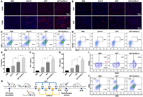 圖6. GFT NCs聯(lián)合A-PD-L1的抗腫瘤免疫應答和腫瘤特異性免疫記憶效應。不同治療14天后,小鼠腫瘤組織切片的CD80+和CD86+ DCs的免疫熒光染色情況(A)、CD4+ T細胞和CD8+ T細胞的免疫熒光染色情況(B),小鼠腫瘤部位的CD4+ T細胞和CD8+ T細胞的比例(C)、免疫抑制Tregs(CD4+CD25+Foxp3+ T 細胞)的比例(D),小鼠血清中IL-6(E)、TNF-a(F)和IFN-g(G)的細胞因子水平;(H)免疫記憶效應的驗證示意圖;(I)不同治療11天后小鼠脾臟中TCM(CD44+CD62L+ T細胞,門控CD8+ T細胞)和TEM(CD44+CD62L-T細胞,門控CD8+ T細胞)的比例;(J)不同治療26天后,小鼠再挑戰(zhàn)腫瘤中CD4+/CD8+ T細胞的比例。