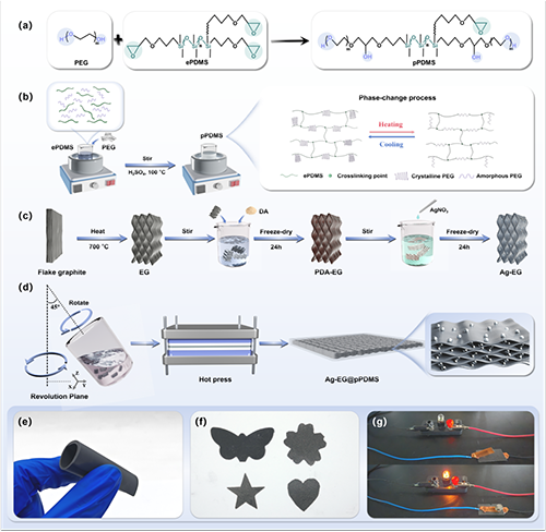 圖1. Ag-EG@pPDMS復合材料的制備過程示意圖和部分特性展示