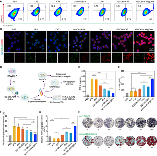 圖5.(A)不同材料處理后巨噬細(xì)胞極化的流式細(xì)胞圖;(B)不同材料處理后細(xì)胞中CD86和CD163表達(dá)的免疫熒光染色結(jié)果圖;(C)條件培養(yǎng)基的提取和培養(yǎng)示意圖;(D-E)檢測不同材料處理后細(xì)胞上清液中的TNF-α和IL-10的表達(dá)水平。(F)不同條件培養(yǎng)基處理后軟骨細(xì)胞的凋亡和壞死情況;(G)不同條件培養(yǎng)基處理后BMSCs中OCN mRNA的表達(dá)水平;(H)不同條件培養(yǎng)基處理后BMSCs的ALP和茜素紅染色結(jié)果。在圖H中,Ⅰ是PBS;Ⅱ是LPS;Ⅲ是CAT;Ⅳ是G2-OH24/BSA;Ⅴ是Que;Ⅵ是G2-OH24/CAT;Ⅶ是G2-OH24/CAT@Que。