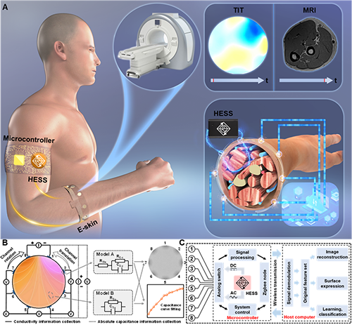 為解決這些問題,北京納米能源與系統研究所陳翔宇研究員團隊提出了一種基于駐極體位移電流的阻抗斷層成像(TIT)的可穿戴技術,可以利用用微安級別的檢測電流實現人體軟組織的成像檢測。這得益于摩擦靜電的超低電流輸出和高度可控的轉移電荷本質特性使得其能夠催生出各種具有優異生物相容性的生物電子設備。在這種情況下,將靜電能量與阻抗斷層成像的成像算法相結合,可能為可穿戴斷層成像系統開創一種獨特的策略。本工作中設計了一種基于復合摩擦起電效應的高精度靜電信號源(HESS),為該TIT系統提供具有卓越生物相容性的高質量探測電信號,同時可以使用遠低于醫療設備安全標準的電流信號實現精細阻抗分析。HESS的總諧波失真達到0.03%,電流變化率降至0.01%。這種信號質量在以往報道的摩擦電設備中從未實現;谠揟IT系統,完成了對人體肢體軟組織的可穿戴時序成像。可以實現對肌肉運動和運動意圖的動態觀察,同時通過TIT設備獲取的橫截面圖像,還能夠區分深層組織中的微小異常病變,例如微骨折。憑借優異的生物相容性和輕量化設計,該TIT設備可與醫療輔助外骨骼或智能防護服集成,用于包括軟組織運動學分析、深層病變監測甚至康復治療等多樣化的應用。