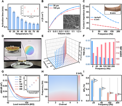 附著于人體用于信號輸出和數據采集的電子皮膚(e-skin)包括四層功能結構——封裝層、支撐層、導電網絡和粘附層,總厚度小于10 μm。導電網絡采用圖案化設計,包括接觸電極和蛇形傳輸線,由Pedot:PSS-聚氨酯(PU)-銀納米線(AgNWs)(PPPA)制成。其余三層功能層則以聚乙烯醇/殼聚糖(PVA/CS)溶液作為基礎材料。PVA/CS與豬皮之間的拉伸強度、剪切強度和界面韌性分別為53.16 kPa、72.76 kPa和2.49 J·m?2。這種粘附強度能夠在500分鐘內提供可靠的附著性能。此外,通過提高AgNWs的長寬比,PPPA的電導率顯著提高。而與商業Ag/AgCl凝膠電極相比,電子皮膚在人體上的接觸阻抗顯著降低,僅為凝膠電極阻抗的35%。