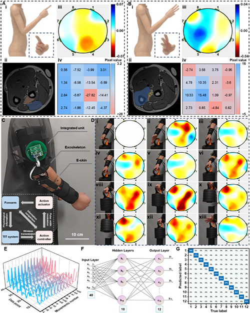 對于人體內部組織,細胞類型和細胞外液分布顯著影響生物組織的電導率,這體現在脂肪(0.021-0.033 S m?1)、血液(0.52-0.83 S m?1)和腦脊液(1.79-1.81 S m?1)等組織的特定電導率上。此外,在不同生理狀態下,組織電導率表現出差異,例如肌肉從靜止狀態過渡到收縮狀態時電導率約變化10%。這些在測量橫截面上的電導率變化可通過邊界電壓反饋到TIT系統,進而重建生理狀態的變化。在將TIT系統應用于生物組織測量時,注入的電流頻率被控制在100 Hz以上。TIT注入人體的電流密度僅為79.58-99.47 mA m?2,顯著低于IEC-60601和GB-9706醫療設備標準規定的安全電流閾值。當手部從握拳狀態變化為伸出食指時,MRI顯示拇長外展肌和示指伸肌發生顯著的肌肉變化,同時其他組織也發生了小的形態變化。這一現象同樣在TIT圖像中體現:紅色表示組織電導率的下降,反映了肌肉收縮;而藍色區域則表明電導率增加,可能歸因于肌肉放松或組織位移。MRI與TIT系統均準確反映了主要肌肉收縮的區域,而橈骨和脛骨的形態及位移變化因較小未能在重建圖像中捕獲。而當手部逐漸伸出食指、中指及無名指時,顯著變化出現在深指屈肌及其鄰近血管組織中,在TIT圖像中表現為相應區域電導率的增加,表明該區域相關組織的放松。隨后,TIT設備被集成到醫療輔助外骨骼中,以驗證其適用性。圖3顯示了裝有TIT設備的外骨骼,電子皮膚貼附在前臂測試區域。HESS和微控制器經過集成后,通過快速拆卸結構安裝在外骨骼上。插圖顯示了與TIT設備集成的外骨骼的系統框架和控制邏輯。外骨骼的用戶,如肌無力患者,嘗試完成上肢動作時,與肌肉形狀相關的變化以及附近組織的鏈式反應均可通過TIT系統識別。基于TIT圖像與穿戴者運動意圖的既定關聯,外骨骼可引導產生輔助力量,幫助肌無力患者完成各種動作。通過負載10.5 kg的實驗評估集成外骨骼的性能,實驗包括12種動作,其中第一個動作為參考動作。當檢測到手部抓握時,外骨骼保持靜止,表明組織變化未能提供足夠的信息預測下一步手臂動作。然而,當提供力量的肌肉的電導率進一步降低,即使實際上未提起重量,TIT系統通過軟組織變化映射出運動意圖。該信息使外骨骼進入主動狀態,從而顯著放松相關組織。在接下來的外骨骼輔助上肢運動過程中,TIT系統持續將內部組織信息反饋至控制器,以評估用戶的運動意圖。將涉及12種動作的運動數據集(80%用于訓練集)導入遺傳算法優化的反向傳播(GA-BP)神經網絡。GA-BP網絡包括3層,輸入層40個神經元,隱藏層18個神經元,輸出層12個神經元(圖4F)。在12種動作上訓練的GA-BP模型平均準確率為97.58%,表現出高識別精度和快速收斂速度。利用基于GA-BP模型的智能增強,集成外骨骼可靠地提供與穿戴者意圖一致的力量支持。