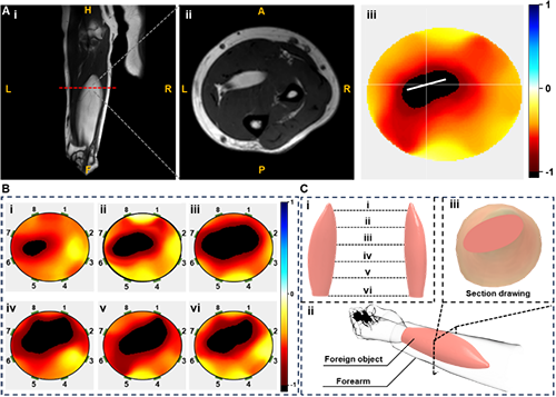 與傳統可穿戴傳感器相比,TIT系統不僅能夠識別肌肉運動,還能檢測深層軟組織的病理性變化。一位前臂脂肪瘤患者參與了病理組織檢測研究。脂肪瘤主要由致密脂肪組織組成,其電導率顯著低于其他軟組織。重建圖像證明了TIT系統在評估脂肪瘤的存在、位置和方向方面的可行性。TIT重建圖像中病變區域(以黑色顯示)略大于MRI觀察到的區域,這歸因于為增強TIT系統在病變檢測中的兼容性而選擇了較低的閾值。此外,對健康志愿者與患者的前臂進行MRI和TIT圖像的連續比較,以評估不同位置的圖像差異。上圖展示了TIT系統在不同位置重建的橫截面圖像,起點位于肘關節下方13 cm處,終點為腕關節。由上圖中的圖像構建的脂肪瘤3D模型,與MRI建立的3D模型相比,體積差異僅為5%。從包含脂肪瘤的集成前臂模型及其橫截面圖像可以看出,該模型具有高保真度,滿足對病理組織的可視化要求。