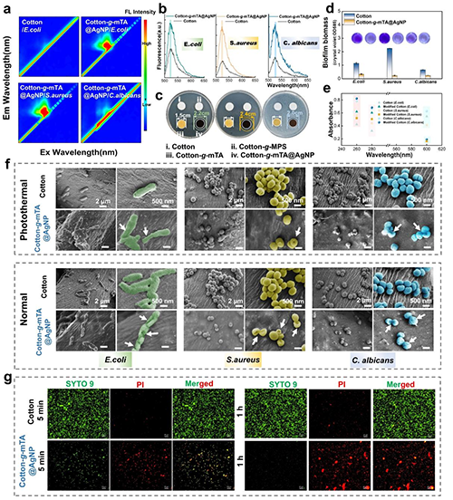 圖3. AgNPs沉積織物多模式協同抗細菌和抗真菌的機制分析