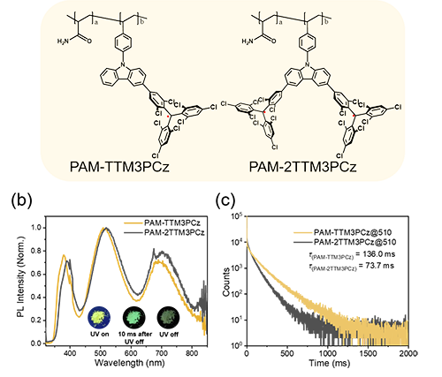 圖1. 自由基聚合物PAM-TTM3PCz和PAM-2TTM3PCz的(a)化學結構,(b)粉末的歸一化熒光光譜(插圖:在關閉365 nm UV燈前(左)和后(中和右)的PAM-TTM3PCz粉末的照片),(c)粉末在510 nm處的壽命衰減曲線(使用300 nm波長激發)。