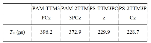 遵循DiVincenzo標準,高自旋態在構建具有多個量子態的量子系統中起著重要作用,而長的自旋相干性時間會更有利于量子信息處理。在本研究中,發光自由基聚合物不僅具有高自旋態特性,同時展現出有較長的自旋相干時間(Tm)。為了評估這些材料的自旋特性,研究團隊利用X波段脈沖電子順磁共振(EPR)技術,在室溫下對所有發光自由基聚合物進行了回波檢測場掃描(EDFS)測量,成功觀察到明顯的自旋回波現象,從而確定了它們的g因子(圖3a和3b)。此外,通過哈恩回波實驗,研究人員測得了室溫下這些發光自由基聚合物的Tm,并通過擬合回波衰減曲線得到自旋相干時間的值(圖3c)。PAM-TTM3PCz的Tm值為396.2 ns,PAM-2TM3PCz為372.9 ns,超過了對比材料PS-TTM3PCz的229.9 ns和PS-2TTM3PCz的228.7 ns(表1)。這一延長的Tm意味著量子位能夠在更長時間內保持其量子態,從而增強了信息存儲的穩定性。