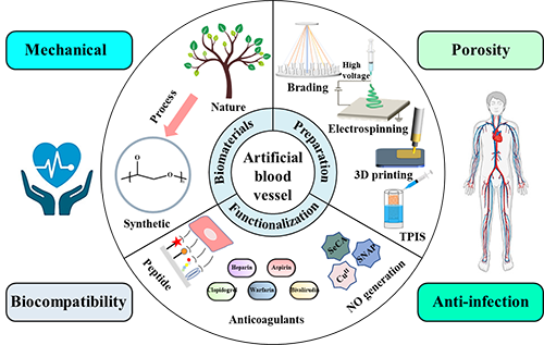 心血管疾病(CVD)是人類死亡的主要原因,約占每年死亡總數(shù)的1/3。當(dāng)存在缺血性心臟病、外周動脈疾病等心臟血管疾病時,機(jī)體血管供血困難,需要對受損血管進(jìn)行修復(fù)、置換或搭橋等手術(shù)干預(yù)。來源于患者的自體移植物,如:隱靜脈、乳腺內(nèi)動脈和橈動脈,因其免疫排斥風(fēng)險低、通暢率高而被認(rèn)為是血管移植物的金標(biāo)準(zhǔn)。然而,自體移植物存在局限性,包括繼發(fā)性創(chuàng)傷、疼痛、感染和供體部位愈合緩慢,這些問題阻礙了它們的廣泛臨床應(yīng)用。因此,開發(fā)能夠模仿天然血管功能的人工血管,恢復(fù)血管周圍的血流或替代受損血管等策略,具有重要的臨床意義。