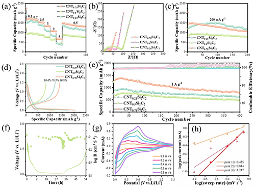 圖4:Si/MWCNT@C 負極的電化學性能。(a) 倍率性能;(b) CNTxSi2C2的奈奎斯特圖(x = 0.25、0.5 和 0.75);(c) 0.2 A g–1時的循環性能;(d) 0.2 A g–1時的 GCD曲線;(e) 1 A g–1時的循環性能;(f) CNT0.5Si2C2的GITT曲線;(g) CNT0.5Si2C2 的 CV 曲線;(h) CNT0.5Si2C2的對數(峰值電流)-對數(掃描速率)曲線