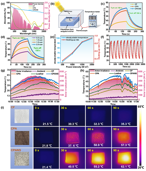 6 CFCPACPANS的太陽光譜吸收率;(b)太陽光加熱性能測試裝置示意圖;(cCFCPACPANS在一個標(biāo)準(zhǔn)太陽輻照度(1000 W/m2)下的時間溫度曲線;(dCPANS在不同太陽輻照度下的時間溫度曲線;(eCPANS在不同太陽輻照度下的穩(wěn)態(tài)溫度和升溫速率;(fCPANS在一個標(biāo)準(zhǔn)太陽輻照度下的光熱循環(huán)穩(wěn)定性;(g-hCFCPA、黑色皮革和CPANS在晴天(f)和陰天(g1000-1700的溫度變化曲線;(iCFCPACPANS在一個標(biāo)準(zhǔn)光輻照度下的紅外熱成像照片