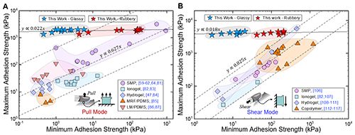 2. 智能粘附的最強和最弱粘附統計。(A)拉開模式下的數據統計。(B)剪切模式下的數據統計。
