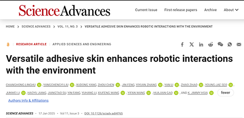 [1]Changhong Linghu, Yangchengyi Liu, Xudong Yang, Zhou Chen, Jin Feng, Yiyuan Zhang, Yan Li, Zhao Zhao, Young-Jae Seo, Junwei Li, Haoyu Jiang, Jiangtao Su, Yin Fang, Yuhang Li, Xiufeng Wang, Yifan Wang, Huajian Gao, and K. Jimmy Hsia. Versatile adhesive skin enhances robotic interactions with the environment.Science Advances, 2025, 11(3): eadt4765.