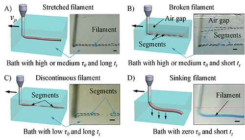 圖3 不同流變特性的支撐浴材料中細絲成型機理。