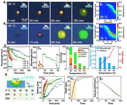 圖2. 5CB墨水的滲透行為及不同溫度下FAS-BPPT的對(duì)應(yīng)顏色變化過(guò)程。A) POM圖像和B) 打印點(diǎn)的反射光譜,在A1, B1) 30 ?C, A2, B2) 35 ?C時(shí)。C1, C2) 打印點(diǎn)的中心波長(zhǎng)(λcenter)變化,C3) 打印點(diǎn)的顏色隨時(shí)間變化。D) 不同溫度下打印點(diǎn)的λred和半徑。E) 模擬結(jié)果:E1) 打印點(diǎn)半徑的變化,E2) 墨水的滲透深度,E3) 不同溫度下基底表面墨水剩余體積隨時(shí)間變化。隨著溫度升高,打印點(diǎn)的紅/藍(lán)移速率增加,導(dǎo)致顏色保留時(shí)間縮短。