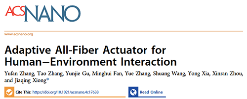 文章信息:Y Zhang, T Zhang, Y Gu, M Fan, Y Zhang, S Wang, Y Xia,X Zhou, J Xiong*, Adaptive All-Fiber Actuator for Human–Environment Interaction, ACS Nano, 2025, https://doi.org/10.1021/acsnano.4c17638
