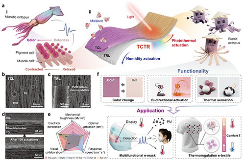 驅-感一體式智能變形材料在機械操控、信息采集、環境探測、智慧醫療和人-機-環境交互等領域展現出巨大應用前景。這類材料開發的難點在于驅動狀態與感知信息的實時同步反饋,限制其復雜交互場景應用。全纖維結構智能變形材料具備微觀特征可調、高設計性和多功能集成等優勢,有望解決這一難題。采用光電雙模響應材料實現驅動變形、電學感知與變色顯示可突破單一電學傳感局限,有望呈現一種更直觀的人-機-環境交互方式。以此構建一種集“感知-驅動-反饋”功能于一體的光電雙模纖維膜驅動器,賦予其環境適應性驅動和光電雙重環境交互能力,有望促進感知型軟體機器人和智能可穿戴裝備的探索和發展。