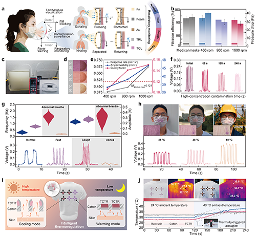 利用TCTR可設計多種動態智能織物和可穿戴設備。例如賦予織物從寒冷環境保暖到炎熱環境散熱的動態調溫,有望促進人體微環境智能管控。此外,通過集成電極賦予TCTR形變觸發式摩擦電效應,證實了一種環境監護式智能口罩。通過在口罩中整合PA織物/含電極TCTR模塊,基于TCTR變形能力依賴于不同呼吸狀態(氣流與其溫濕度)、空氣質量和環境溫度的原理,可觸發呼吸時TCTR/PA層間有效接觸面積差異,產生可區分的電學信號與變色效果,實現人體狀態和環境信息的實時感知,有望提升人體-環境交互舒適性和安全性(圖5)。