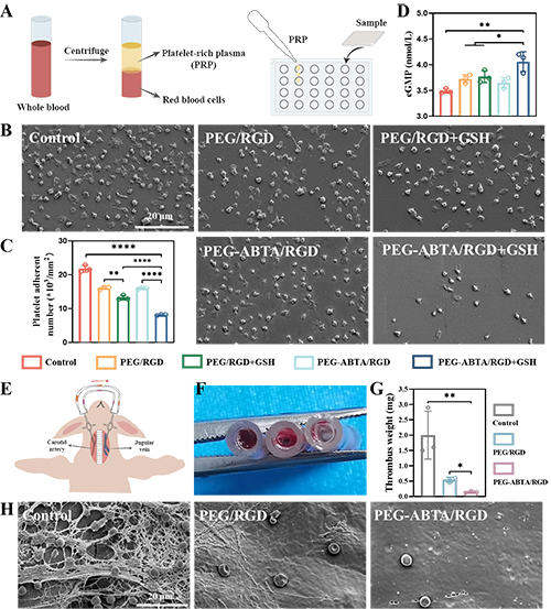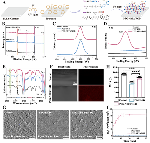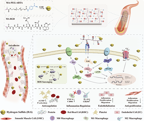 該研究通過二苯甲酮介導的兩步光引發聚合,在聚乳酸(PLLA)支架表面構建了由硫醇觸發型H?S供體(ABTA)、聚乙二醇(PEG)和RGD多肽組成的聚合物分子刷涂層。涂層的理化性質經XPS、ATR-FTIR、熒光標記、AFM、SEM和EDS等手段進行了系統表征。亞甲基藍(MB)法證實該涂層可在谷胱甘肽(GSH)作用下釋放H?S。支架涂層釋放的H?S展現出多重生物調控功能。具體而言,H?S可提升血小板中cGMP水平并下調P選擇素表達,從而抑制血小板黏附與活化,減少纖維蛋白原的結合,顯著增強涂層的抗血栓性能。同時,H?S可清除活性氧(ROS),誘導巨噬細胞向具有組織修復功能的M2表型極化,促進抗炎微環境的形成。在平滑肌細胞中,H?S誘導其轉變為收縮表型,抑制異常增殖與遷移,有助于維持血管的彈性與收縮功能;在內皮細胞中,H?S上調促進黏附、增殖與遷移的關鍵基因(如ITGA2、DUSP10和MICALL2),同時下調與不良重塑相關的基因(如MYL9和FSTL3),加速內皮化并形成穩定的內皮覆蓋。該涂層通過對多種血管相關細胞行為的選擇性調節,協同促進血管穩態與功能修復,有效抑制再狹窄的發生,顯著提升支架的長期療效。