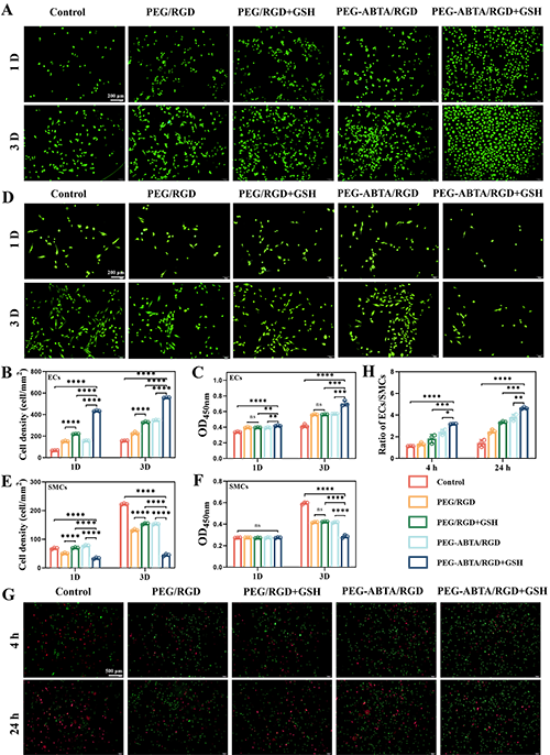 圖4. H?S釋放涂層對內皮細胞(ECs)和平滑肌細胞(SMCs)行為的調控作用,(A)ECs,(D)SMCs,(G)綠色:ECs,紅色:SMCs