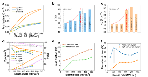 圖2 高熵聚合物的介電儲能。a,電滯回線;b,效率對比;c,放電能量密度對比;d,放電能量密度和效率;e,導電損耗與鐵電損耗; f,鐵電損耗對比。
