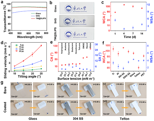圖3. TM@SLIPS光學特性與超滑性能:a-b) TM@SLIPS的高透明度;c) 生物被膜厚度對涂層的浸潤性影響;d) TM@SLIPS在不同傾斜角度、不同體積下的水滑動速度;e) TM@SLIPS對不同液體均表現出優異的超滑性能;f-g) TM@SLIPS的基底普適性。