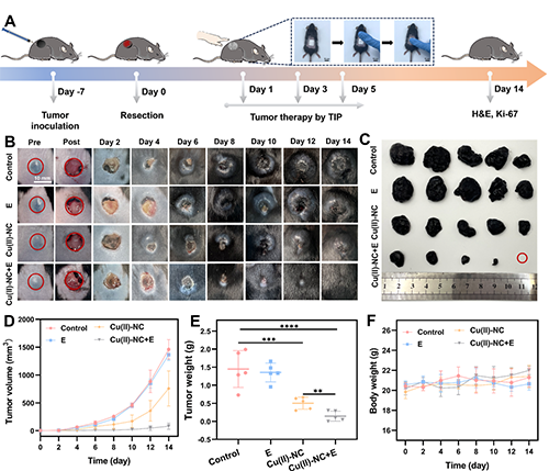 在B16F10腫瘤不完全切除小鼠模型中驗證了TIP的療效。治療14天后,Cu(II)-NC+E組獲得最佳治療效果,創面基本愈合,腫瘤尺寸最小,H&E染色顯示腫瘤細胞核碎裂、結構崩解,Ki-67陽性率顯著降低,顯示出有效抑制了腫瘤的術后增殖。
