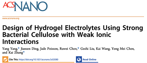 該工作以“Design of Hydrogel Electrolytes Using Strong Bacterial Cellulose with Weak Ionic Interactions”為題發(fā)表在近期的ACS Nano上,楊洋副教授和碩士研究生丁建森為該論文主要完成者,陜西科技大學為第一通訊單位,該工作還得到了倫敦大學學院陳儒維博士的大力支持。此工作得到了國家自然科學基金面上項目(22378254)、陜西省科協(xié)青年人才托舉計劃(20240202)、先進造紙與紙基材料全國重點實驗室開放基金(202304)的資助。