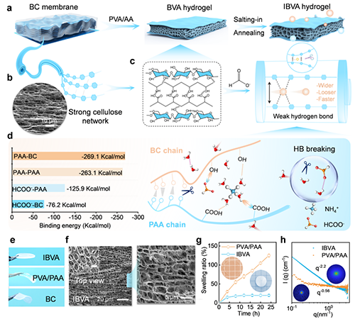 本工作通過熱引發(fā)聚合和鹽溶液浸泡法制備了具有高離子電導率和高機械性能的IBVA水凝膠電解質(zhì)。如圖1a、b所示,將BC膜浸沒在PVA/AA前驅(qū)體中,并進行常規(guī)凝膠化工藝以制備BVA水凝膠。在此過程中,BC鏈上暴露的羥基與PVA和PAA鏈上的羥基和羧基之間形成了大量的氫鍵(HBs),構(gòu)成了一個致密而有凝聚力的網(wǎng)絡(luò)(圖1c)。隨后,BVA內(nèi)多余的水分通過退火過程去除。最后,將制備好的BVA水凝膠浸泡在3 M甲酸銨溶液中重建聚合物網(wǎng)絡(luò),形成最終的IBVA水凝膠。由密度泛函理論計算(圖1d)可知,PAA?PAA和BC-PAA的結(jié)合能要高得多,證實它們之間存在大量的HBs。鹽浸過程后,甲酸陰離子與聚合物鏈的相互作用相對較弱,部分破壞了聚合物之間原有的HBs。這種作用有利于聚合物網(wǎng)絡(luò)的移動,進而有利于NH 4+的快速遷移,并有利于調(diào)節(jié)水凝膠的機械柔韌性。