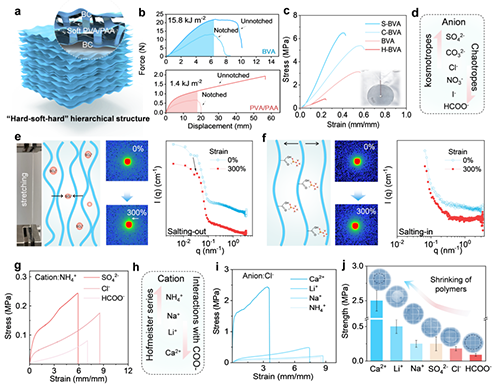 IBVA水凝膠呈現(xiàn)出均勻而致密的片層結(jié)構(gòu),其間距為~ 5 μm,其中相鄰的片層相互連接,形成了特殊的層級結(jié)構(gòu)(圖1f)。這種層級結(jié)構(gòu)賦予了IBVA水凝膠獨特的抗溶脹性能,可以有效抵抗甲酸銨溶液引起的吸收和潤脹(圖1g)。小角散射(圖1h)結(jié)果表明,在加入BC膜后,PVA/PAA從松散排列的無序結(jié)構(gòu)向密集排列的有序結(jié)構(gòu)轉(zhuǎn)變。這種有序結(jié)構(gòu)可以描述為“硬-軟-硬”的互鎖結(jié)構(gòu)(圖2a)。其中,剛性的BC骨架結(jié)構(gòu)充當“磚”,而軟的PVA/PAA組分充當BC層之間的“粘合劑”,形成了獨特的“磚與砂漿”結(jié)構(gòu)。這有助于有效的能量耗散,從而形成堅固而堅韌的聚合物網(wǎng)絡(luò)。