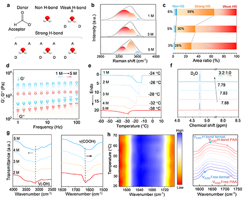 實現(xiàn)機械性能和離子電導率之間的最佳平衡取決于精確調(diào)節(jié)三種主要成分之間的界面相互作用:離子、聚合物鏈和溶劑,其中離子起著關(guān)鍵的連接作用。結(jié)果表明①BVA凝膠具有剛性框架,保持了更穩(wěn)定的結(jié)構(gòu)。而純PVA/PAA凝膠則不穩(wěn)定,在鹽溶過程中溶脹甚至溶解,在鹽析過程中收縮。②離子可以有效地調(diào)節(jié)聚合物鏈的聚集狀態(tài)以及與溶劑的相互作用,這大多是以失去作為離子導體的自由水為代價而導致力學性能的極大改善。而甲酸離子在水凝膠中仍然保留了足夠的自由水,只是犧牲了一部分機械強度,從而保證了離子的導電性。③SO42-的“鹽析”效應誘導聚合物在PVA/PAA水凝膠中聚集,導致形成更加致密的孔隙,從而增強了機械應力。④HCOO-的“鹽溶”效應導致聚合物鏈間距增大和孔徑增大,并表現(xiàn)出弱HB相互作用和有利的水化環(huán)境(圖3)。綜上所述,“鹽溶”效應有效地協(xié)調(diào)了水溶液和聚合物鏈之間的關(guān)系,極大地促進了離子的傳遞過程(圖4)。