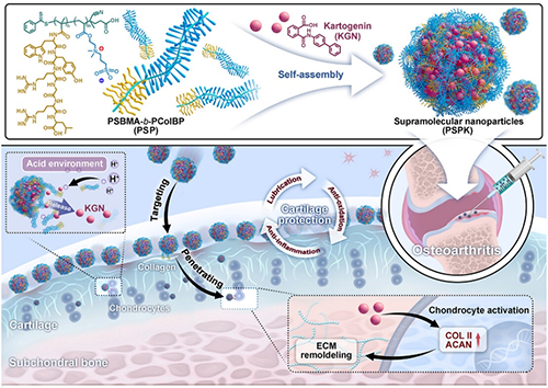 針對上述問題,研究團隊設計了一系列潤滑性高分子材料以提高關節腔注射材料的長效穩定性和生物功能性,主要包括:兩性離子光熱納米酶(Adv. Mater., 2023, 35, 2303299)、環刷狀兩性離子聚合物(Mater. Horiz., 2023, 10, 2554-2567)和定制化聚合物盔甲(Mater. Horiz., 2024, 11, 5352-5365。針對關節炎的復雜微環境和軟骨天然的電場屏障,研究團隊近期報道了一種具有pH響應性和深層軟骨穿透能力的超分子聚兩性離子納米顆粒(PSBMA-b-PColBP@KGN,PSPK),為骨關節炎治療提供了全新策略(圖1)。