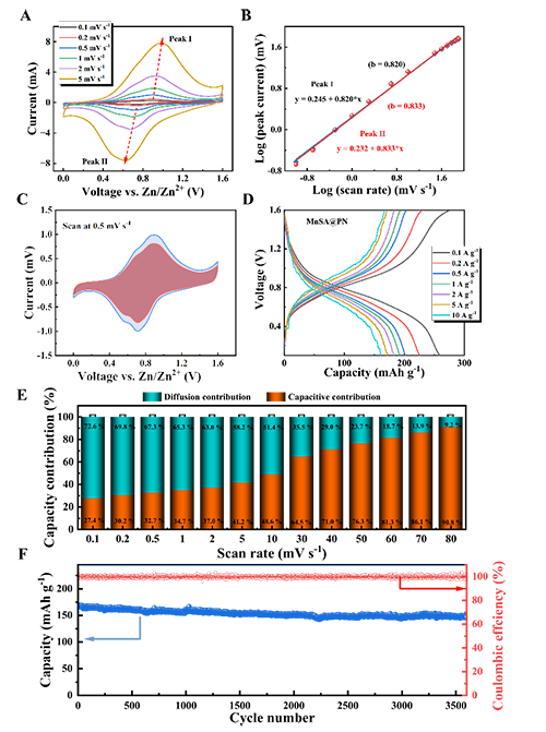 MnSA@PN組裝的Zn//MnSA@PN電池CV曲線如圖2,呈現(xiàn)出一對明顯的氧化還原峰,這與MnSA@PN電極中PN的氧化還原反應、Mn2+的溶解/沉積或Zn2+的嵌入/脫嵌有關。通過擴散和電容過程相對于掃描速率的整體電容行為。結果表明,大部分電荷存儲是通過電容機制而不是擴散機制發(fā)生的。隨著掃描速率的增加,電容貢獻率持續(xù)增長。在5 A g-1電流密度下,經(jīng)過3600次循環(huán)后,容量保持率為86.8%,表現(xiàn)出穩(wěn)定的循環(huán)性能。