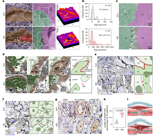 接下來,研究人員探究了NO突破基底膜屏障的機制。掃描電鏡顯示,NO誘導腫瘤血管內皮細胞間形成大量內皮間隙(平均尺寸約195 nm)。體外HUVEC模型表明,NO顯著增大細胞間隙面積,減少細胞粘附連接。機制研究表明,NO通過誘導VE-cadherin酪氨酸658位點磷酸化,加速VE-cadherin降解,同時引發肌動蛋白骨架重構,從而增強內皮細胞間隙開放。在體內實驗中,NO同樣促使VE-cadherin表達下降及磷酸化水平上升,進而打開內皮屏障,暴露出原本被隱匿的基底膜結構。