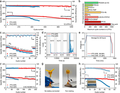 近期,武漢理工大學徐林教授團隊與新加坡國立大學Chaobin He教授團隊合作,通過氟代丙烯酸酯單體和碳酸亞乙烯酯(VC)單體的原位共聚設計,成功制備出具有優異界面穩定性和電化學性能的聚酯基電解質PTV-SPE。該聚合物電解質可通過原位側鏈錨定作用屏蔽并保護環狀碳酸酯結構上的酯基,有效抑制聚碳酸酯基電解質與鋰金屬負極的界面降解,從而提升固態電池的界面穩定性。此外,本研究首次結合TOF-SIMS、XPS和AIMD等方法,系統研究了聚碳酸亞乙烯酯基聚合物電解質在鋰金屬界面的降解路徑。相較于已有研究,該工作提出了提高聚碳酸酯基電解質穩定性的新策略,為聚合物基固態鋰金屬電池的發展提供了新思路。該工作以“Anchoring Side Chains to Carbonate Groups for Reviving Stable Polycarbonate-Based Solid-State Lithium Metal Batteries”為題發表在《Journal of the American Chemical Society》上。文章第一作者是Hantao Xu,Wei Deng,Jingyuan Yu。文章第一單位是武漢理工大學。該研究得到國家自然科學基金委的支持。