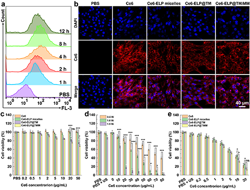 圖3. (a)C6細(xì)胞與Ce6-ELP@TM/MM培養(yǎng)不同時間后的流式細(xì)胞術(shù)檢測結(jié)果(n = 3)。C6細(xì)胞與不同材料孵育4小時后的激光共聚焦圖像(b,比例尺為40 μm)。(c)在沒有超聲的情況下,C6細(xì)胞與不同材料培養(yǎng)24小時后的活力(n = 6)。(d)在不同條件下,Ce6與C6細(xì)胞共培養(yǎng)后經(jīng)不同條件超聲照射(1 MHz)的活力(n = 6)。(e)不同材料與C6細(xì)胞共培養(yǎng)后在超聲照射下的細(xì)胞活力(1 MHz、1 W/cm2和40 s,n = 6)。在圖c-e中,ns表示無統(tǒng)計學(xué)差異,*表示p < 0.05,***表示p < 0.001。