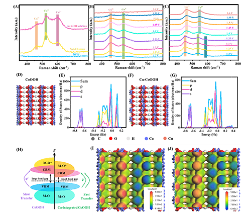 圖3 這種優(yōu)異的性能是由于Cu的加入減少了CoOOH的帶隙,d軌道電子在費米能級附近的貢獻更顯著,operando拉曼表征和理論計算驗證了5-HMF與Cu集成CoOOH催化劑之間存在強相互作用,這歸因于Cu物種改變了局部電荷密度區(qū)域,并使羥甲基和甲酰官能團穩(wěn)定吸附。