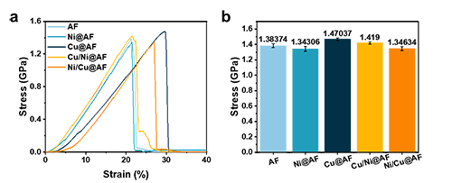 圖4 (a) AF、Ni@AF、Cu@AF、Cu/Ni@AF和Ni/Cu@AF的應力應變曲線。(b) AF、Ni@AF、Cu@AF、Cu/Ni@AF和Ni/Cu@AF的抗拉強度
