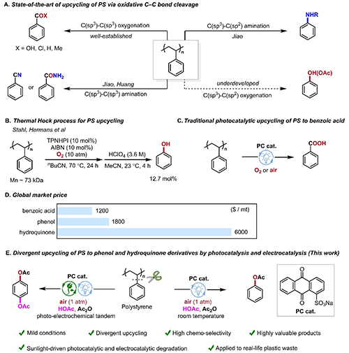 當前大多數報道的方法主要通過光催化、電化學或熱催化等多種催化系統,實現聚苯乙烯Csp3–Csp3鍵的氧化,生成苯甲酸及苯甲酰類衍生物(圖1A)。而Csp3–Csp2的轉化研究相對較少,焦寧教授團隊通過有機疊氮化物作為氮源實現了選擇性Csp3–Csp2斷裂胺化的突破。盡管上述方法拓展了聚苯乙烯升級回收的研究廣度,但直接一步實現Csp3–Csp2氧化生成高附加值酚類產物的策略仍亟待開發探索。