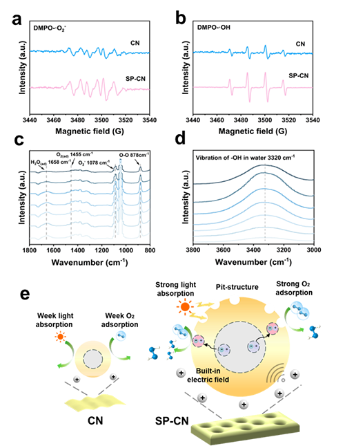 Fig.8 CN和SP-CN材料在壓電光催化過程中捕獲(a)·O2-和(b)·OH的ESR光譜。H2O2和反應位點之間的電荷密度差映射:(c,d)壓電光催化H2O2生產過程中表面凹坑結構SP-CN的原位DRIFT光譜。(e)SP-CN壓電光催化合成H2O2的機制示意圖。
